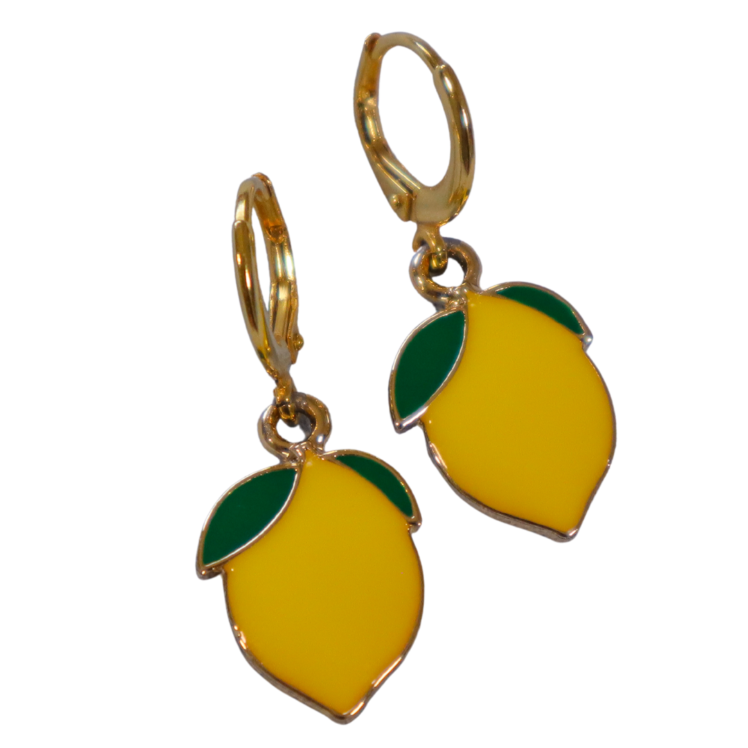 Cute and dainty huggie hoop earrings made of 18k gold-plated sterling silver. These beauties feature a little Lemon Drop alloy charm. Assembled at our SS studio.