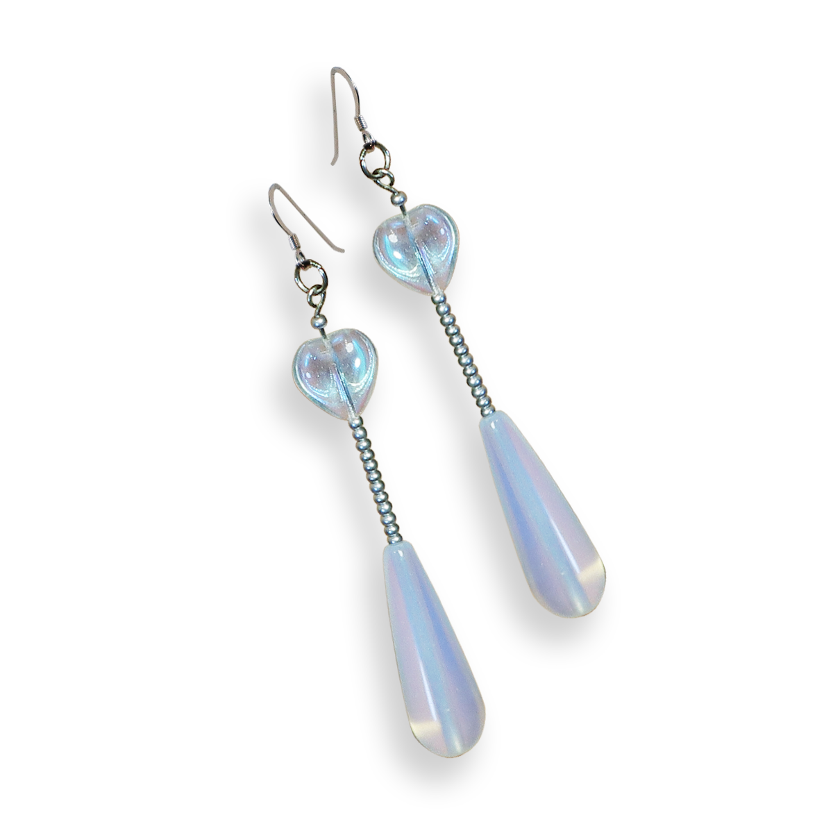 Icy glass hearts, silver beads, and opalite droplets.