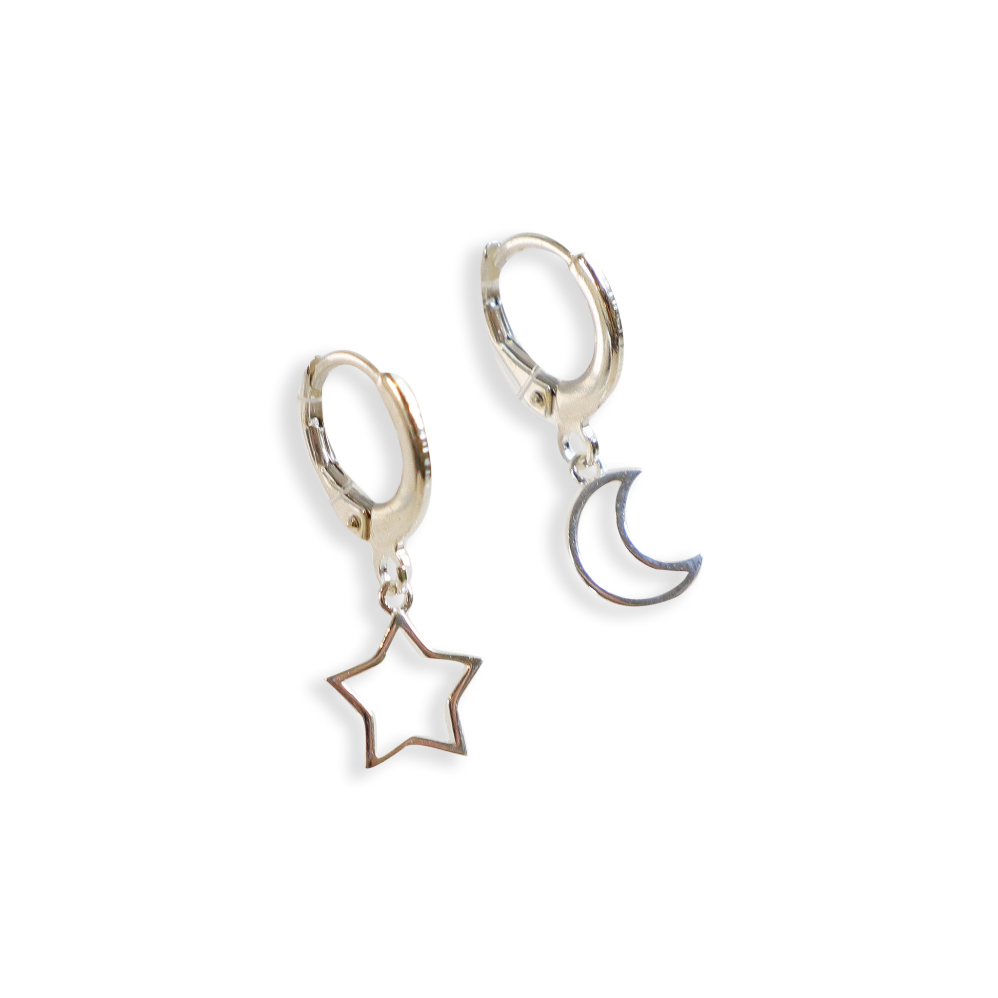 Cute and dainty huggie hoop earrings made of sterling silver/18k gold-plated sterling silver. These beauties feature a contrasting charms of a star and crescent moon. Assembled at our SS studio.