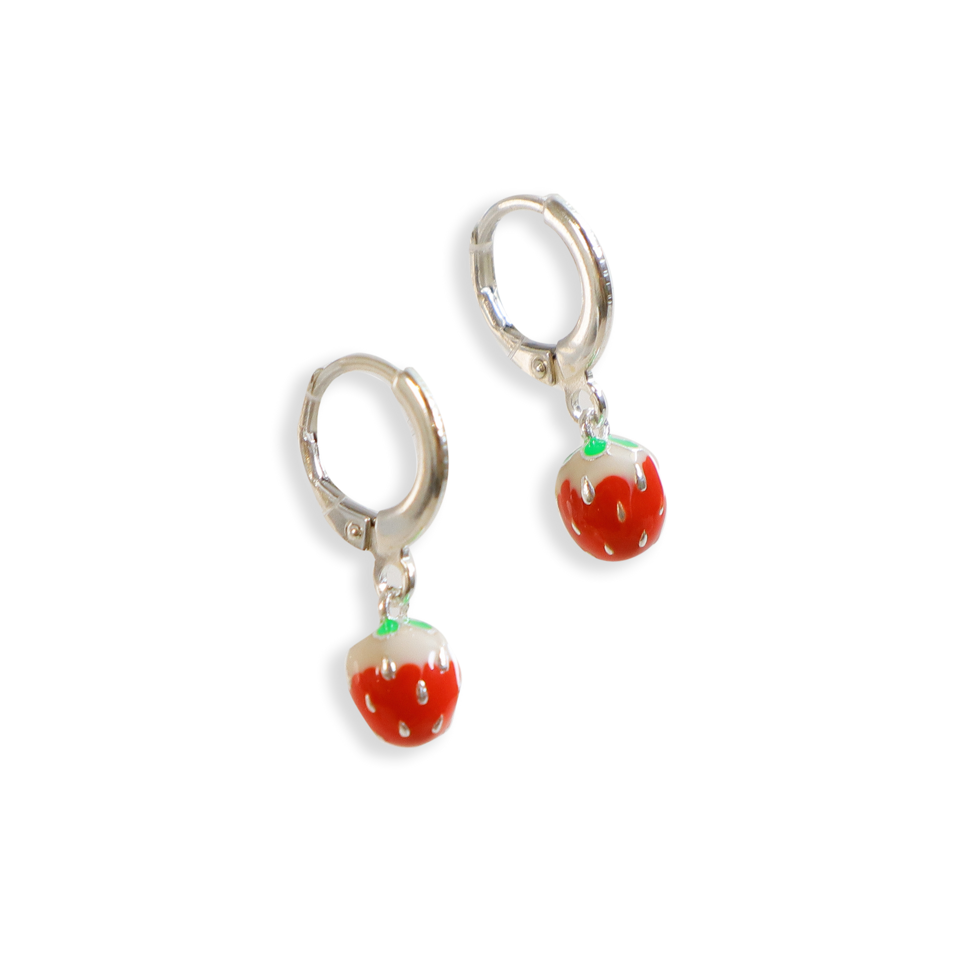 Cute and dainty huggie hoop earrings made of sterling silver. These beauties feature a little drop enamel strawberry charm. Assembled at our SS studio.